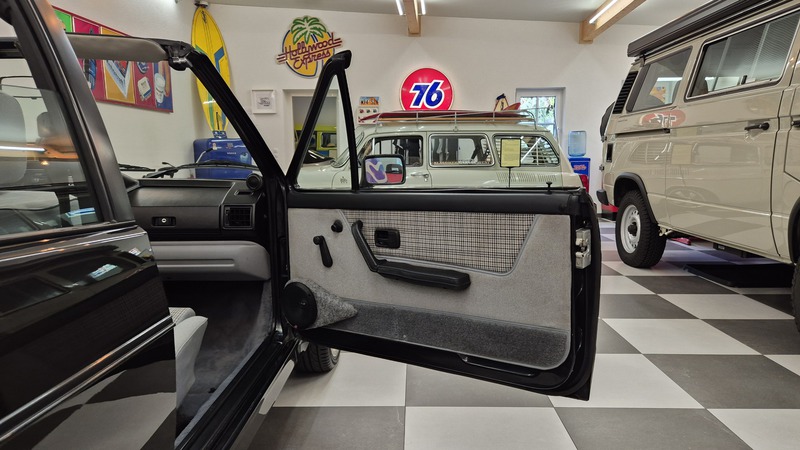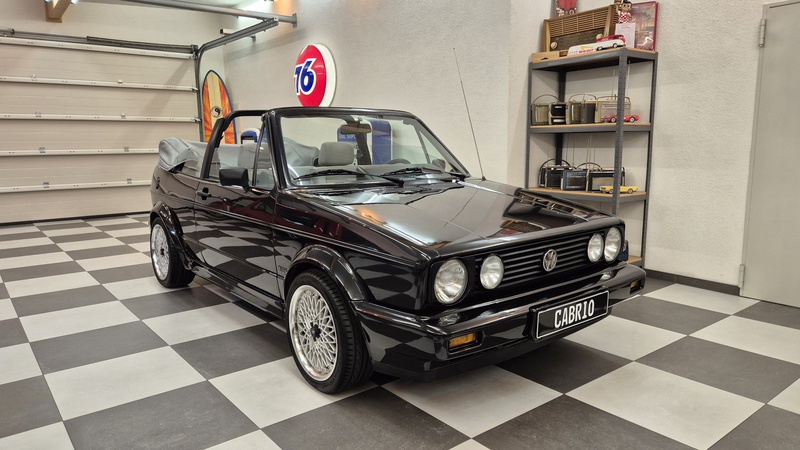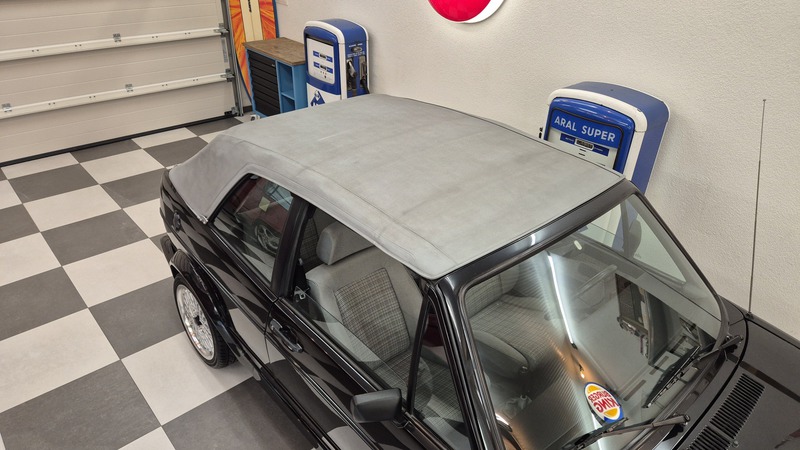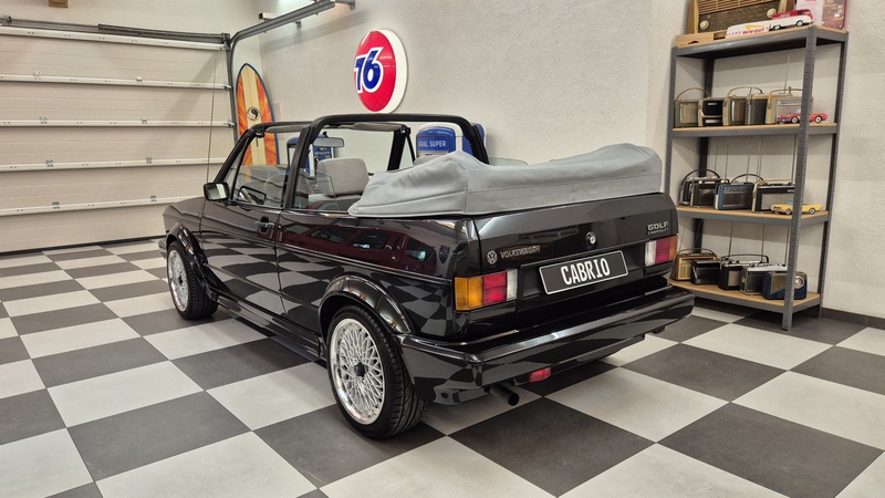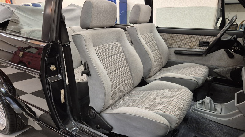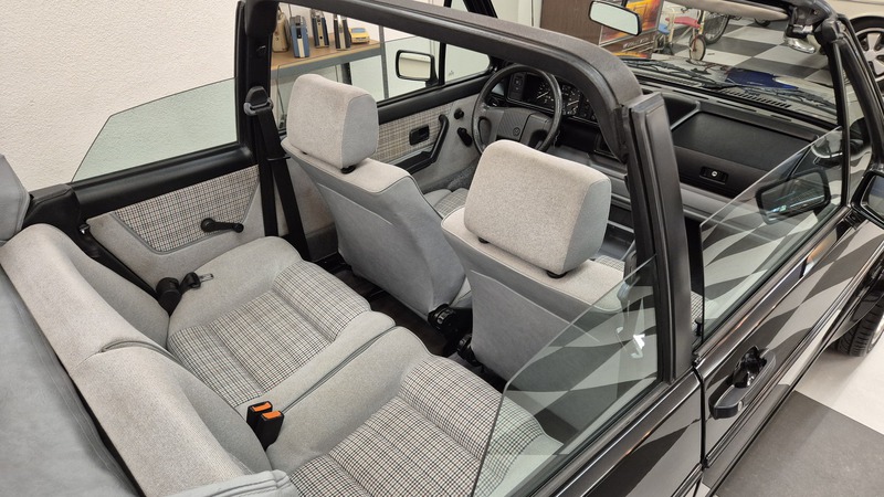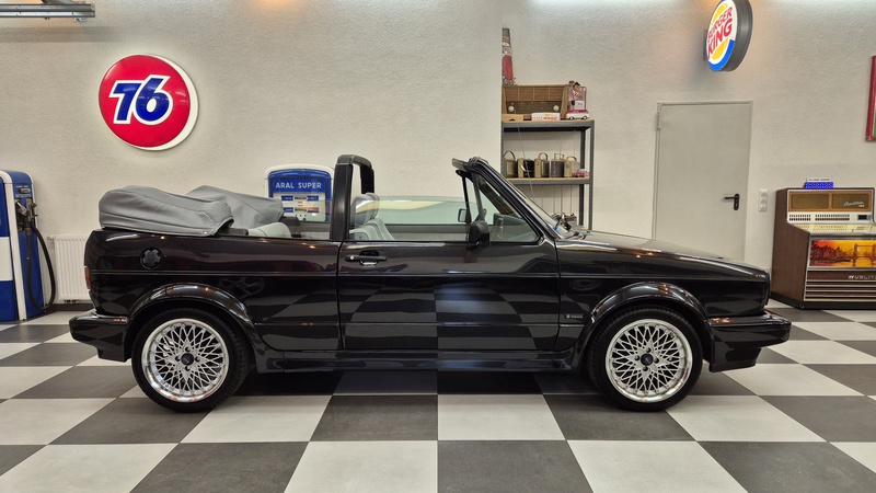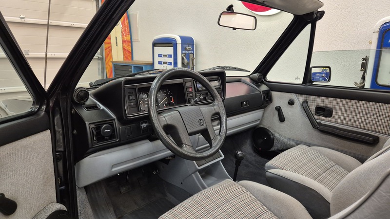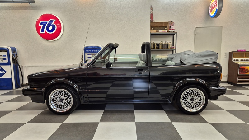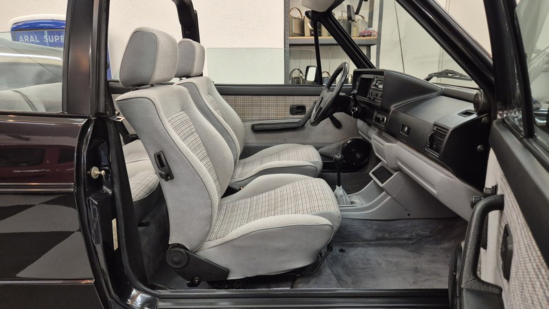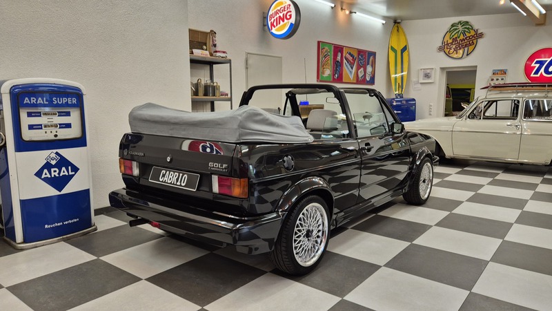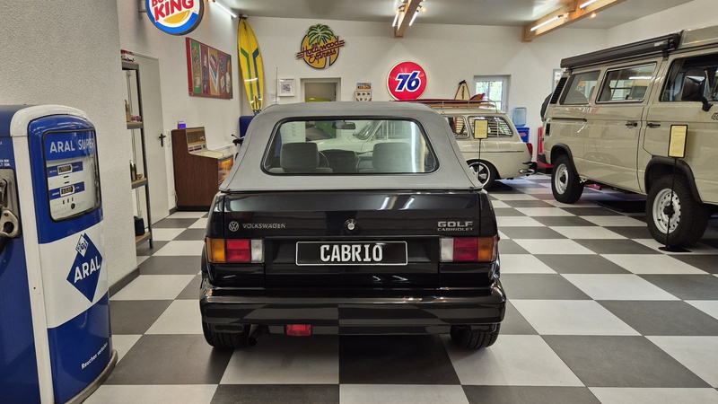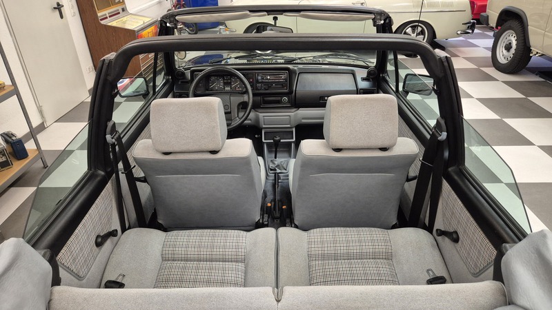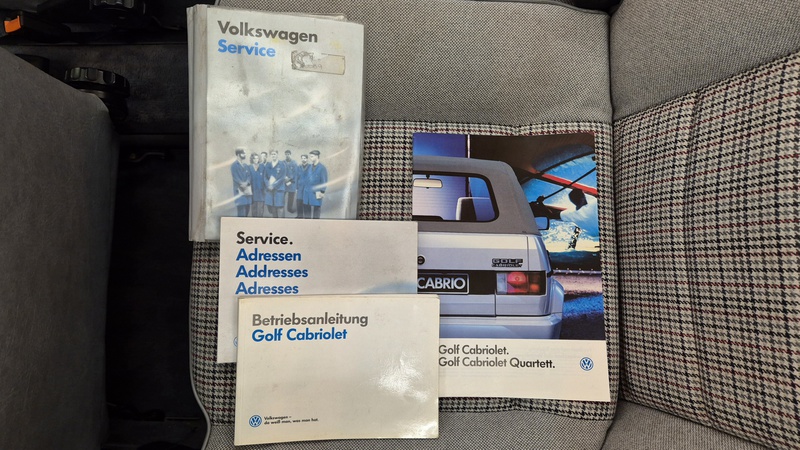 Erdbeerkörbchen-Zeit. Dieses Golf 1 Cabrio wurde 1990 von einem VW-Vertragshändler in der Nähe von Frankfurt am Main an seine Erstbesitzerin verkauft. In den darauffolgenden 15 Jahren ließ diese jeden Service ausschließlich bei besagtem Händler durchführen, weshalb der Golf dort bei allen Mitarbeitern bekannt war. Als die Besitzerin ihn im Jahr 2005 verkaufen wollte, schlug ein Mitarbeiter des VW-Autohauses zu und kaufte ihn kurzerhand. Weitere 13 Jahre später übernahm ihn der nächste Mitarbeiter, der ihn bis heute behielt. Der Golf, mit dem 1,8L / 98 PS Motor wurde also seit der Erstauslieferung von ein und derselben VW-Werkstatt gepflegt. Er wurde bisher 143.000 Kilometer gefahren und befindet sich in einem dementsprechend guten Zustand. Wir haben den Wagen direkt in diesem Autohaus übernommen, wobei uns die komplette Historie ausgehändigt wurde. Zusätzlich sind noch das originale Verkaufsprospekt, die Bordmappe sowie die Fußmatten und Nummernschildunterlagen von 1990 vorhanden. Der Wagen hat aktuell neuen TÜV sowie das H-Kennzeichen erhalten, die Felgen sind natürlich ebenfalls eingetragen.