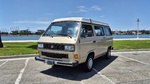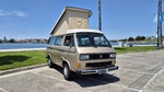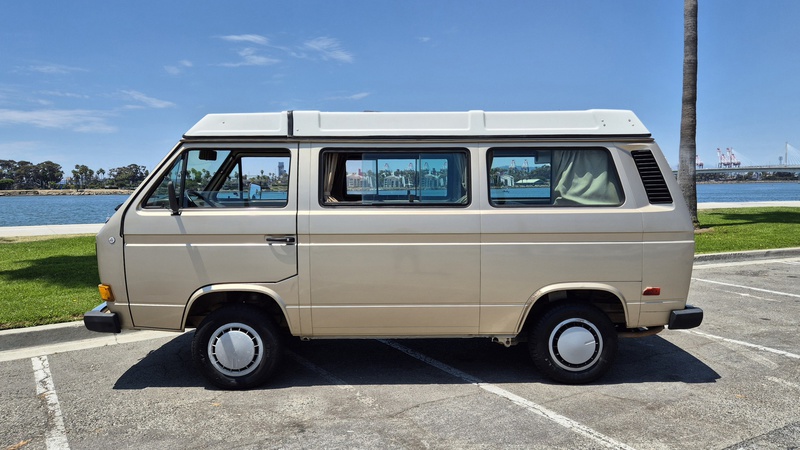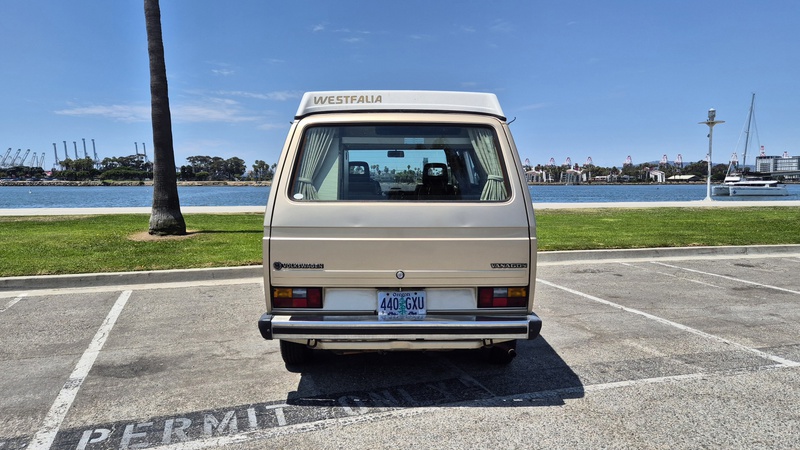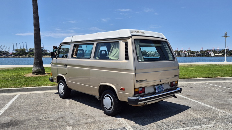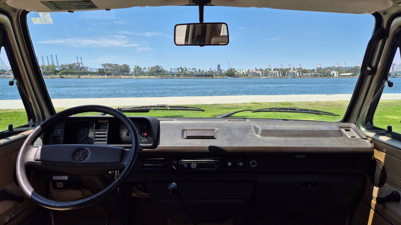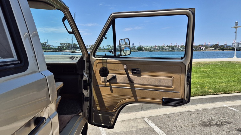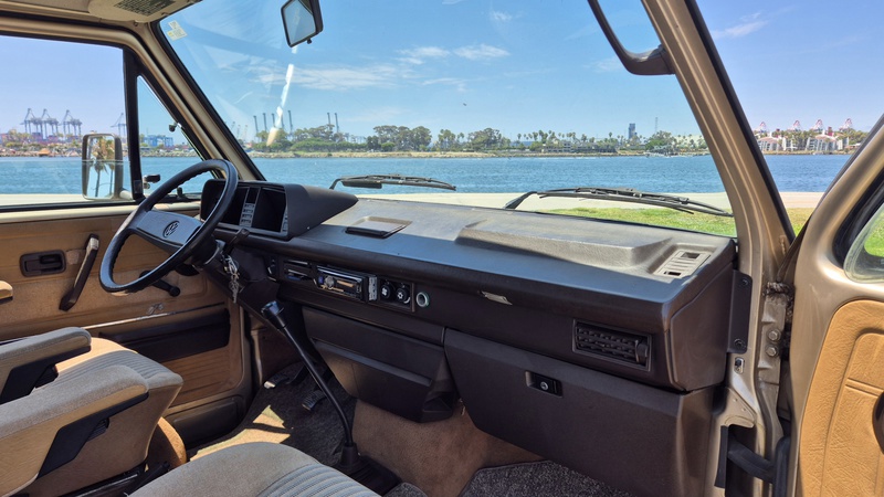 Dieser richtig gut erhaltene T3 Weekender stammt aus dem Bundesstaat Washington, nahe der Grenze zu Kanada. Er wurden im Oktober 1987 im VW Nutzfahrzeugewerk in Hannover gebaut und als Neuwagen in die USA verschifft. Der Erstbesitzer hatte ihn als Wolfsburg Edition bestellt. Bei diesem Sondermodell wurden unter anderem Extras wie die grüne Wärmeschutzverglasung mit Ausstellfenstern vorne und Schiebefenstern in der Mitte, das gepolstertem Armaturenbrett, sowie Velourssitze mit passend farbigem Teppich und passend farbigen Tür- und Seitenverkleidungen verbaut. Zudem weist das ´87er Modell eine Besonderheit auf, die es weder davor, noch danach, nochmal so gab. Es ist das einzige Modelljahr, bei dem der Wolfsburg Edition als Zwittermodell, noch mit den klassischen Chromstoßstangen, gleichzeitig aber schon mit Rechteckscheinwerfern ausgeliefert wurde. Zusätzlich gab es ab jetzt ausschließlich den 2,1 Liter Wasserboxer-Motor mit 95 PS (Motorkennbuchstabe MV).