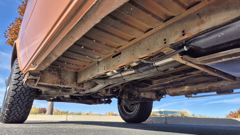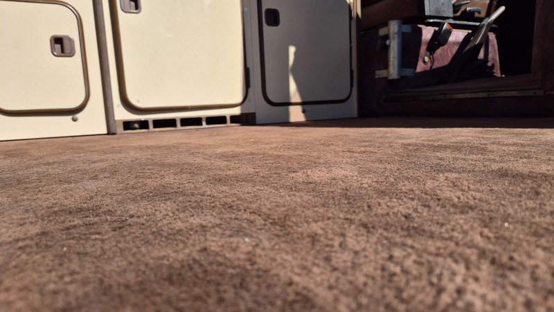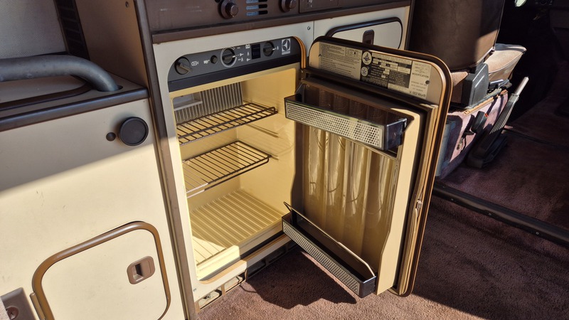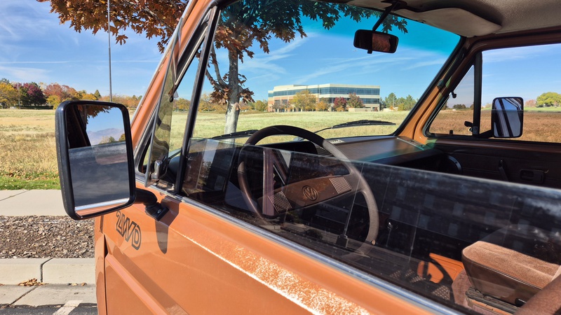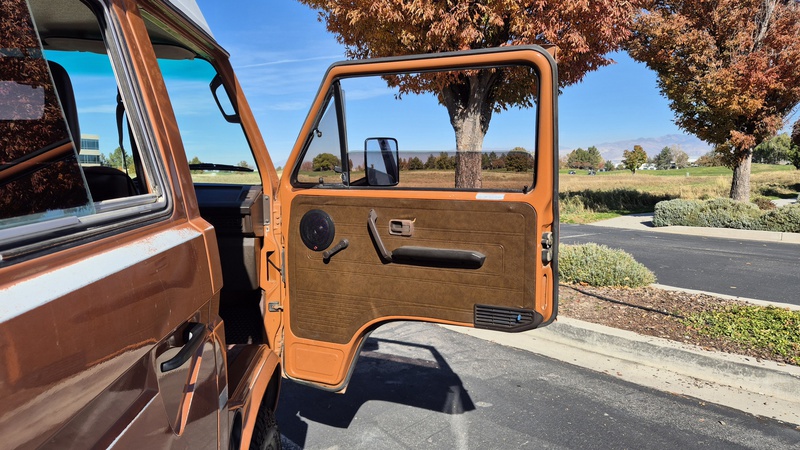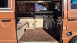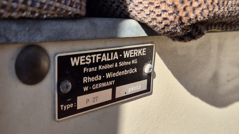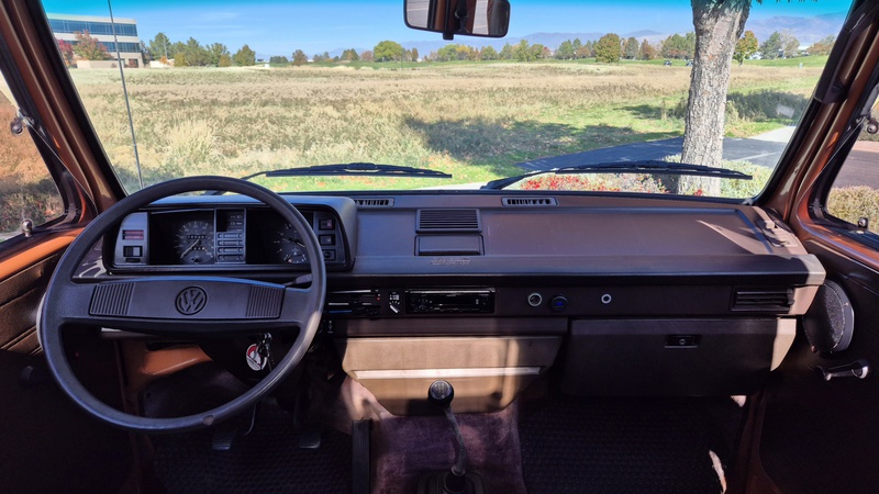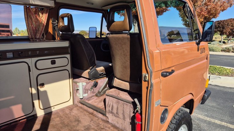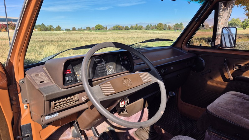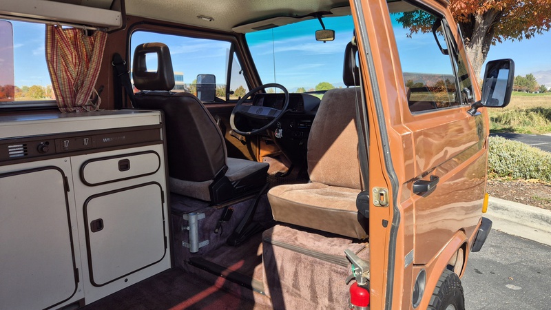 Den 1984er Westfalia in assuanbraun, konnten wir von Jeff, einem langjährigen Bekannten und Sammler mit eigener Werkstatt, in Utah kaufen. Jeff übernahm ihn selber vor ein paar Jahren, nachweislich aus erstem Besitz, in Kalifornien. Der Bulli wurde im Juli 1984 in Deutschland gebaut und traf im September in den USA ein. Für den kalifornischen Markt wurde er mit einigen Extras ausgeliefert. Neben grüner Wärmeschutzverglasung mit Ausstellfenstern vorne und Schiebefenstern in der Mitte, bekam er als Vanagon L, ab Werk, einigen weiteren Luxus spendiert. So wurde er mit Chomstoßstangen und Chromkedern in den Scheibenrahmen, der Innenraum mit Veloursitzen, Veloursteppich, sowie Prallleiste auf dem Armaturenbrett versehen. Die Westfalia-Ausstattung bietet mit der zum Bett umklappbaren Rückbank, sowie dem Aufstelldach, Schlafplätze für vier Personen. Darüber hinaus gib es die vorderen Drehsitze, den Kocher, den Kühlschrank, den Tisch, sowie viele Staumöglichkeiten.