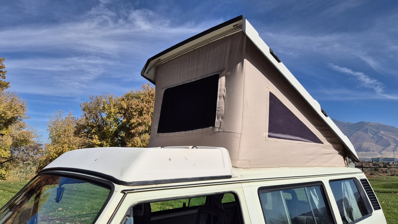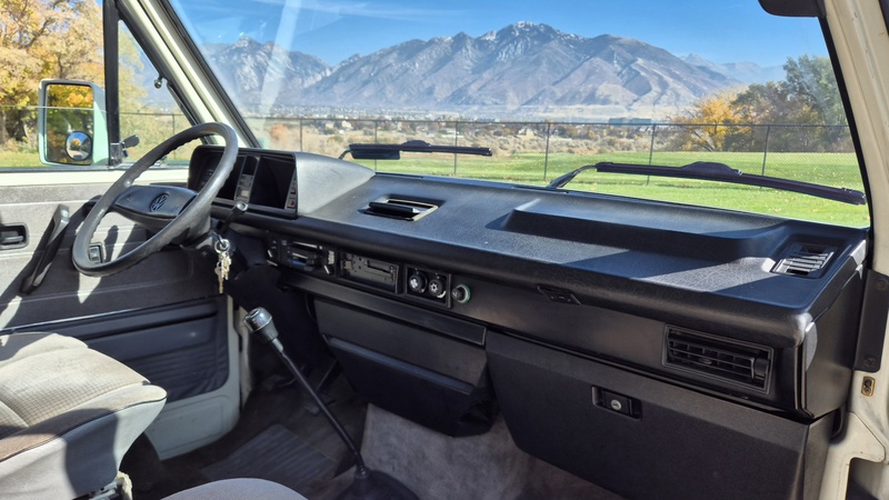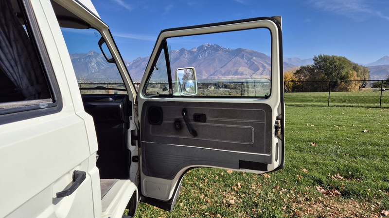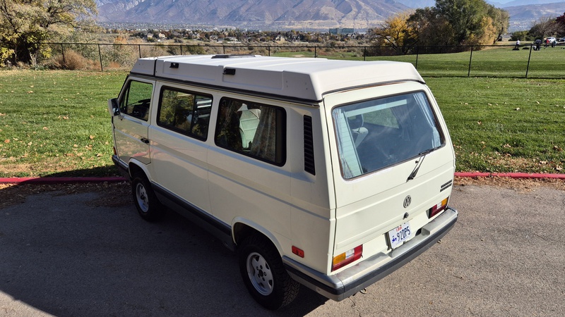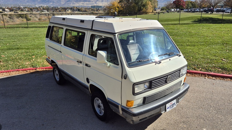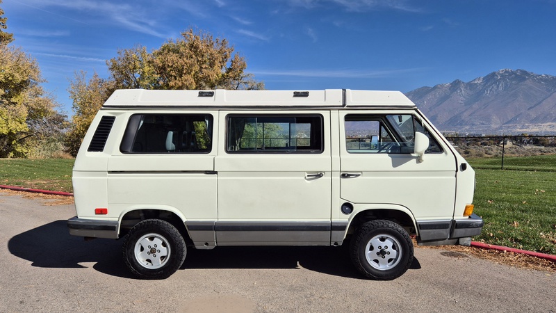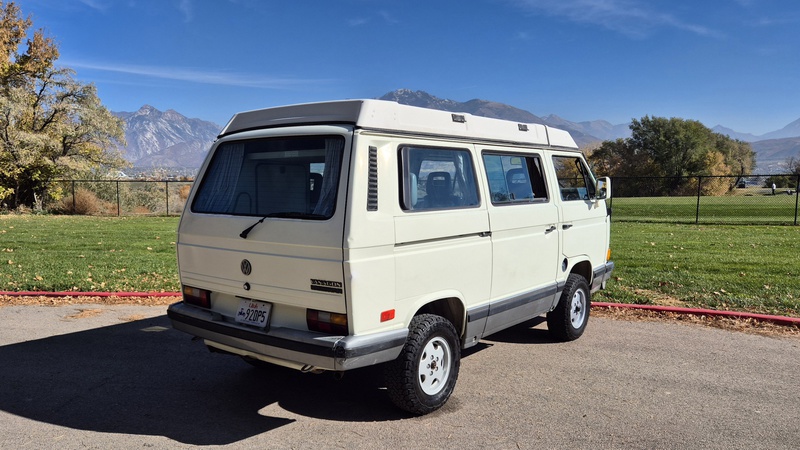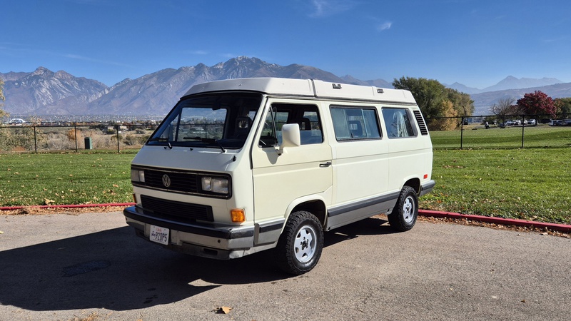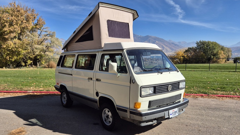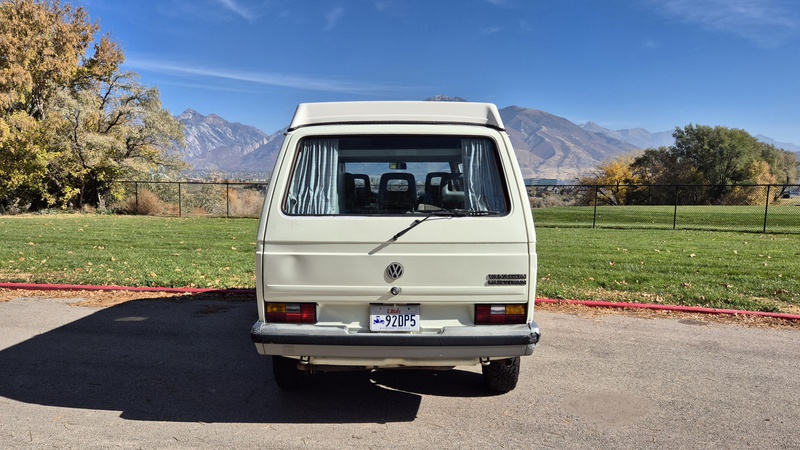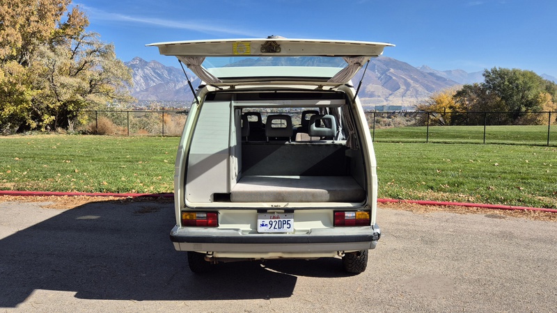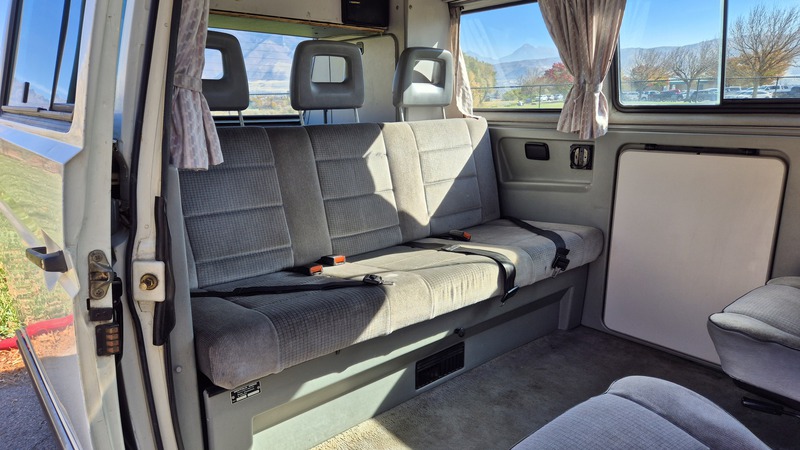 Den pastellweißen 1990er Weekender konnten wir von Derek in Salt Lake City ankaufen. Auch wenn wir die Ausstattung eines Weekenders schon oft beschrieben haben, gehört sie natürlich auch hier wieder dazu. Wie der Name es schon sagt, wurden die Weekender ab Werk, als eine Mischung aus Multivan und Westfalia-Camper ausgeliert. Sie hatten mit der zum Bett umklappbaren Rückbank, Tisch und den Back to Back Sitzen, genau wie ein Multivan, Platz für sieben Personen, hatten wie ein Westfalia dann doch das Aufstelldach, mit zwei weiteren Schlafplätzen, sowie hinteren Stauschränken. Der Hintergrund erschließt sich von selbst, diese Fahrzeuge waren für Kunden gedacht, die einen Alltags-Bulli benötigten, den sie, wie es der Name schon sagt, am Wochenende für Ausflüge mit Übernachtung nutzen konnten. Die letzten Weekender tragen deshalb neben dem Vanagon auch den Multivan-Schriftzug am Heck, eine Bezeichnung, die es für den US-Markt sonst nie gab.