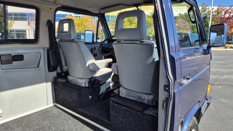 Unser Weekender erhielt ab Werk sehr viele Extras. Neben der Multivanbeplankung und den Multivan-Alufelgen wurde er mit den in Wagenfarbe lackierten, elektrisch verstellbaren Spiegeln, den Rechteckscheinwerfern, sowie ringsherum grüner Wärmeschutzverglasung, mit Ausstellfenstern vorne und Schiebefenstern in der Mitte versehen. Der Innenraum erhielt weitere Extras, wie das gepolsterte Armaturenbrett, mit Cockpit mit Drehzahlmesser und Digitaluhr, dem, wegen der verbauten Servolenkung kleinere Lenkrad und Velourssitze mit Armlehnen vorne. Der Erstbesitzer unseres Bullis bestellte zudem ein Automatikgetriebe, Tempomat, Zentralverriegelung und die selten zu findende Klimaanlage unter dem Hochbett.