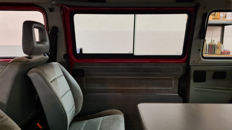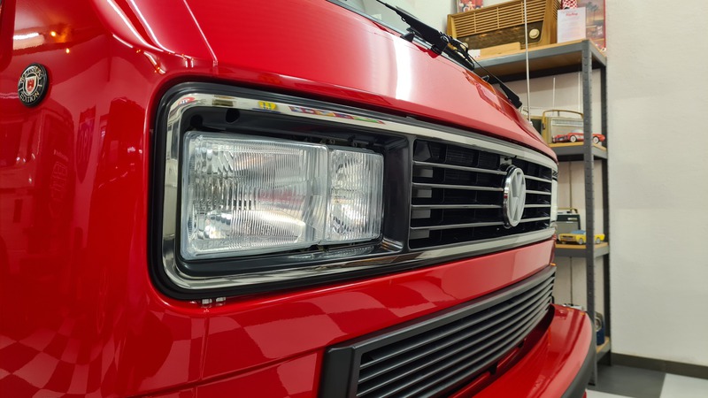 Aufgrund der besonderen Historie, befand sich der Bus bereits bei unserem damaligen Ankauf in sehr gut erhaltenem Karosseriezustand. Der tornadorote Lack hatte über die Jahre allerdings gelitten und Rob hatte sich zu einer Neulackierung im Originalfarbton entschieden. Der anschließende Aufbau erfolgte unter Verwendung vieler Neuteile, bzw. überarbeiteter Originalteile. So wurden, neben einem neuen Kühler-, sowie Scheinwerfergrill, neue Embleme, viele neue Gummis und Dichtungen, sowie sehr viele weitere neue Kleinteile verbaut. Die originalen Multivan-Felgen wurden lackiert, die Innenausstattung aufbereitet, der Teppich und die Bezüge gereinigt. Die Technik mit dem originalen 2,1 Liter Wasserboxer (Motorkennbuchstabe MV) war ebenfalls entsprechend gepflegt, der Bulli lief bereits damals richtig gut. Aber auch hier wurde eine umfangreiche Inspektion durchgeführt, viele Verschleißteile an Bremse und Fahrwerk getauscht, sowie viele weitere kleinere Arbeiten durchgeführt. Der Wagen wird mit neuem TÜV, H-Kennzeichen, sowie deutschen Fahrzeugpapieren übergeben. Eine Besichtigung bei uns in Hückelhoven ist nach Terminabsprache jederzeit gerne möglich.