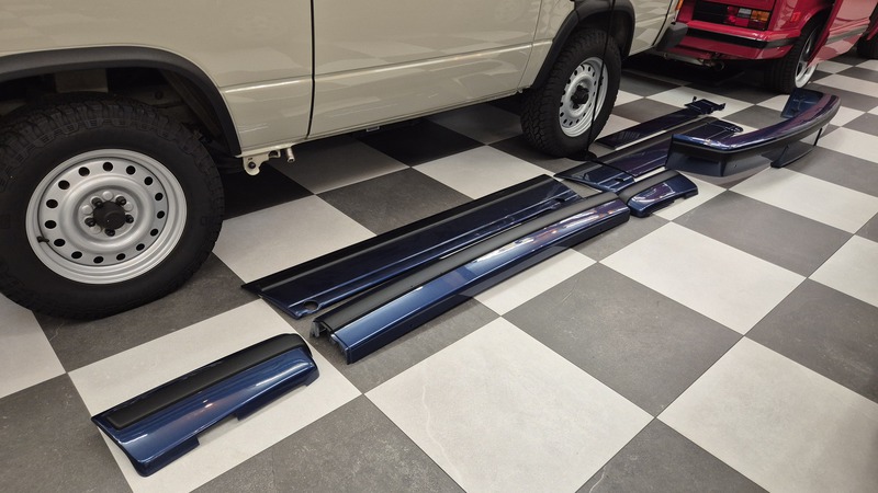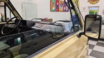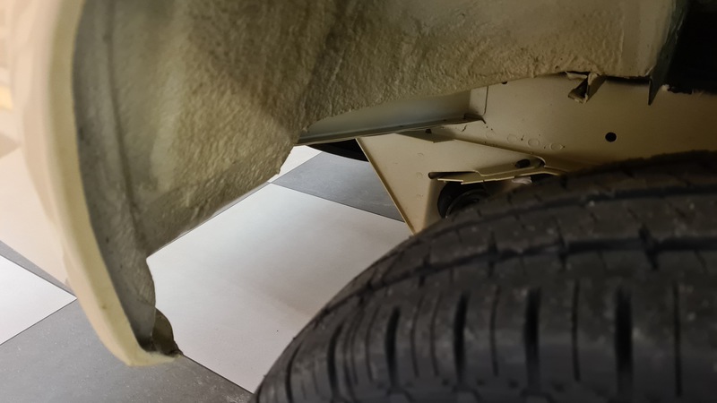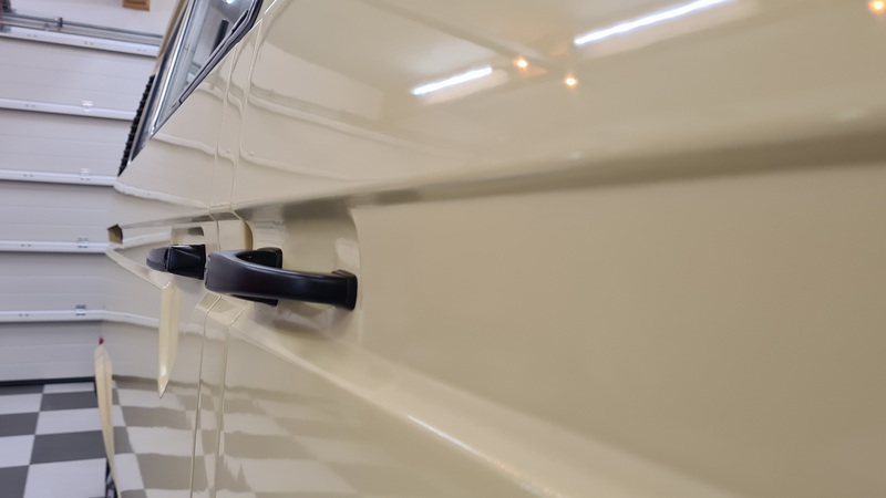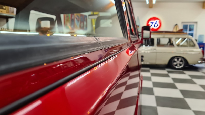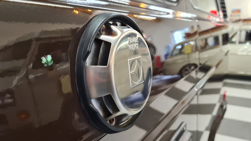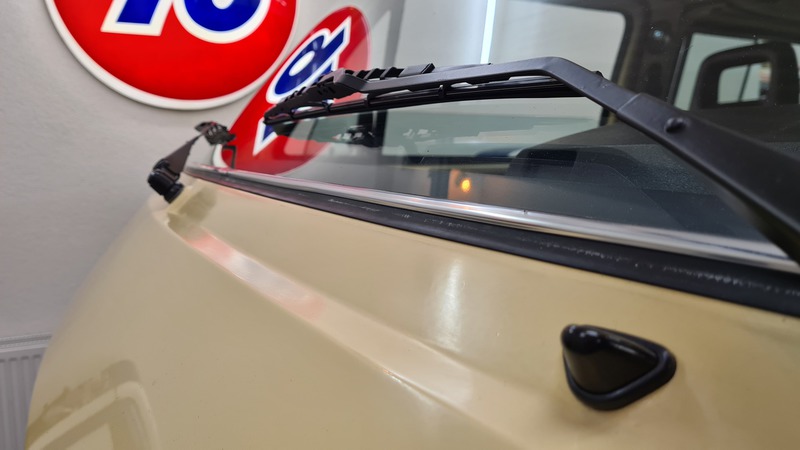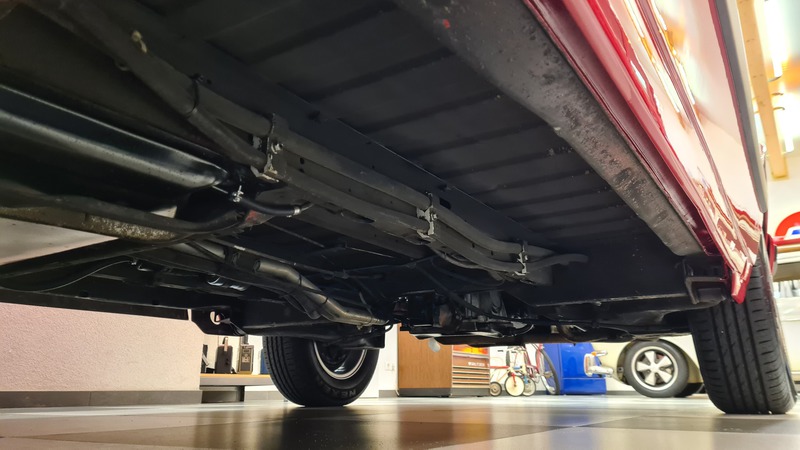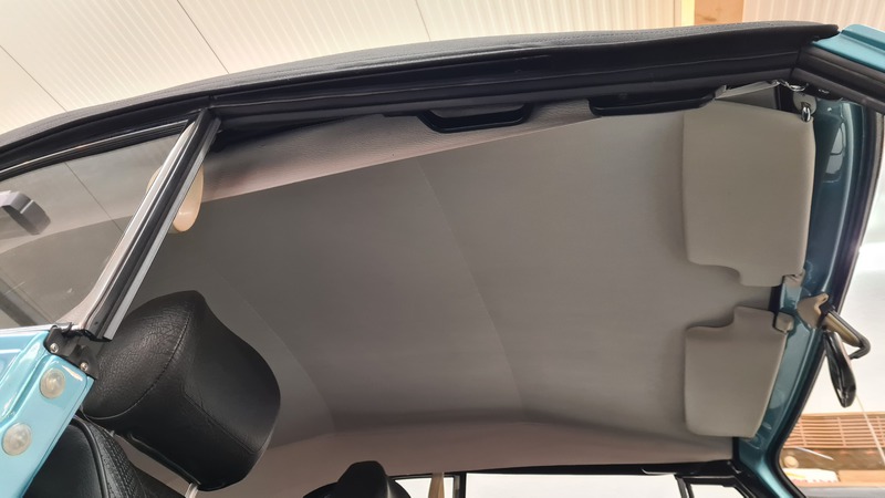 Bei unserem Ankauf befand sich der Wagen annähernd komplett im Erstlack. Abgesehen von ein paar, durch Parkrempler etc. herbeigeführten Beschädigungen, befand sich die Karosserie, selbst für kalifornische Verhältnisse, in außergewöhnlichem Erhaltungszustand. Die Nähte sind wirklich perfekt, der Unterboden ebenso. So perfekt, dass dieser erstmal trockeneisgestrahlt wurde, um auch den wenigen, restlichen Schmutz der Jahre zu entfernen. Und wir können hier wohl behaupten, dass es kaum einen besseren unrestaurierten Unterboden geben kann. Durch die kalifornische Sonne war der Lack auf dem Dach sehr dünn geworden, weshalb wir es neu lackieren lassen haben. Auch die Blessuren der Jahre wurden von „unserem“ Karosserie- und Lackierbetrieb professionell entfernt, sowie die Beplankung ringsherum in Wagenfarbe neu lackiert. Der Wagen wurde im Anschluss komplett gereinigt, der Erstlack poliert. Weil im Erstbesitz Platz für den Rollstuhl benötigt wurde, waren die Back to Back Sitze leider nicht mehr vorhanden und wurden deshalb von uns durch originale, identische Sitze ersetzt. Auch der originale hellgraue Veloursteppich wurde bereits 1990 gegen einen anderen getauscht, was wir jetzt ebenfalls komplett in den Originalzustand zurückgerüstet haben. So ist die Innenausstattung jetzt ebenfalls wieder komplett, wie im Jahr 1990.