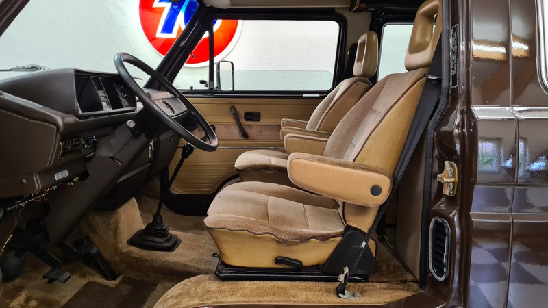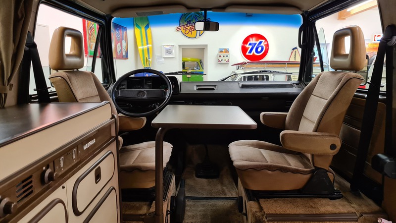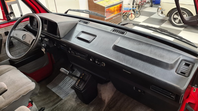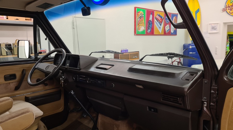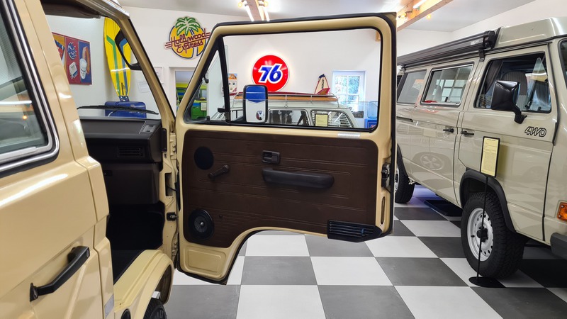 Und dieser Auslieferungszustand, war beim Vanagon Carat, der Top Ausstattung der T3 Multivan für den US-Markt, richtig umfangreich. Außen hatten diese Fahrzeuge die „dicken“ Stoßstangen mit Frontspoiler, die passenden Seitenbeplankungen, die in Wagenfarbe lackierten, elektrisch verstellbaren Spiegel und die rechteckigen Doppelscheinwerfer. Innen wurden die Vanagon Carat mit der Multivan-Ausstattung versehen, somit ab Werk mit zum Bett umklappbarer Rückbank, ausklappbarem Tisch, Transistorleuchte und den beiden Back to Back Sitzen. Im „Luxuxmodell“ Carat gab es dann zusätzlich die große Klimaanlage, Veloursitzen mit Armlehnen vorne, das gepolstertem Armaturenbrett, das passend zur Servolenkung kleinere und ebenfalls gepolsterte Lenkrad, Drehzahlmesser, Tempomat, Zentralverriegelung und viele weiteren Extras. Für den kalifornischen Markt wurde hier dann noch die grüne Wärmeschutzverglasung mit Ausstellfenstern vorne und Schiebefenstern in der Mitte verbaut. Eine umfangreichere Ausstattung ist auch hier also kaum möglich.