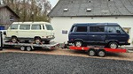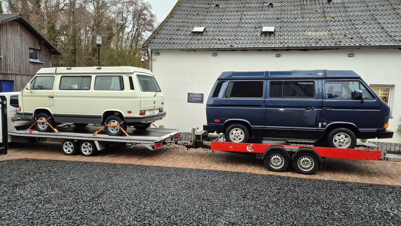 Dass wir zwei annähernd identische Bullis an zwei Freunde verkaufen, haben wir auch nicht jeden Tag. Eben waren Christoph und Thilo mit Hund Carlo aus dem Saarland bei uns, um ihre pastellweißen '90er Weekender abzuholen. Sie hatten sich direkt nachdem wir die T3 in Kalifornien angekauft und die jeweiligen Bilder und Informationen hochgeladen hatten, gemeldet und beide Fahrzeuge gekauft. Jetzt, einige Wochen später, waren die Camper bei uns in Hückelhoven eingetroffen, haben beide eine Inspektion, TÜV und das H-Kennzeichen erhalten und wir haben beiden noch eine Anhängerkupplung montiert. Und so geht es in Zukunft auf gemeinsame Mountainbike Touren mit den T3. Wir wünschen Euch ganz viel Spaß dabei und allzeit gute Fahrt mit den Zwillingen.