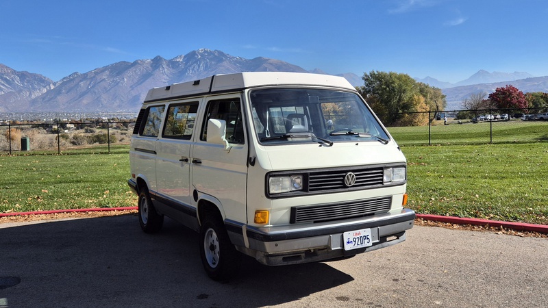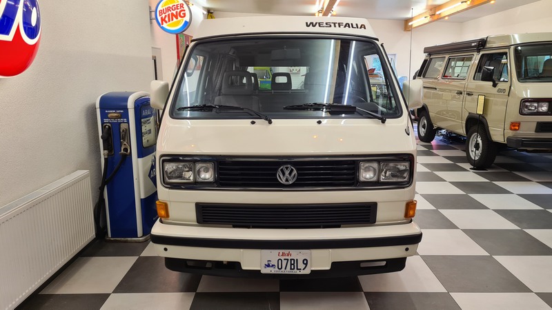 Hier folgen die Informationen und Bilder vom pastellweißen 1990er Weekender, den wir gestern von Derek, in Salt Lake City ankaufen konnten. Auch wenn wir die Ausstattung eines Weekenders schon oft beschrieben haben, gehört sie natürlich auch hier wieder dazu. Wie der Name es schon sagt, wurden die Weekender ab Werk, als eine Mischung aus Multivan und Westfalia-Camper ausgeliert. Sie hatten mit der zum Bett umklappbaren Rückbank, Tisch und den Back to Back Sitzen, genau wie ein Multivan, Platz für sieben Personen, hatten wie ein Westfalia dann doch das Aufstelldach, mit zwei weiteren Schlafplätzen, sowie hinteren Stauschränken. Der Hintergrund erschließt sich von selbst, diese Fahrzeuge waren für Kunden gedacht, die einen Alltags-Bulli benötigten, den sie, wie es der Name schon sagt, am Wochenende für Ausflüge mit Übernachtung nutzen konnten. Die letzten Weekender tragen deshalb neben dem Vanagon auch den Multivan-Schriftzug am Heck, eine Bezeichnung, die es für den US-Markt sonst nie gab.