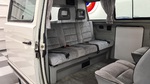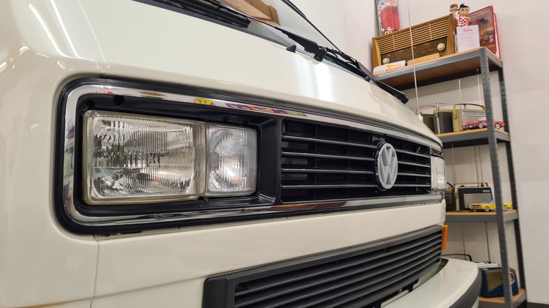 Und eben wegen dieses guten Karosseriezustands haben wir ihn hier als Erstes trockeneisstrahlen lassen. Hierbei wird der Schmutz der letzten Jahrzehnte vom Unterboden entfernt, der Lack bleibt dabei vollständig erhalten. So strahlt der Bulli jetzt auch am Unterboden und in den Radkästen wieder im originalen Pastellweiß. An der Außenseite haben wir von unserem Karosserie- und Lackierbetrieb ein paar Gebrauchsspuren entfernen lassen. Keine Schäden, sondern kleinere Kratzer bzw. Dellen, die nicht ins Gesamtbild passten. Gleichzeitig haben wir die für den US-Markt grau lackierte Beplankung und die Stoßstangen in Wagenfarbe lackieren lassen. Der Erstlack wurde poliert und im Anschluss versiegelt. Den Scheinwerfergrill und die Chromembleme haben wir gegen Neuteile ersetzt, die originalen Multivan-Alufelgen wurden entlackt, pulverbeschichtet und mit neuen Reifen wieder montiert. Die originale Innenausstattung wurde lediglich gereinigt und befindet sich ebenfalls in sehr gut erhaltenem Zustand. Der Faltenbalg im Aufstelldach wurde bereits in den USA gegen ein Neuteil mit drei Fenstern ersetzt.