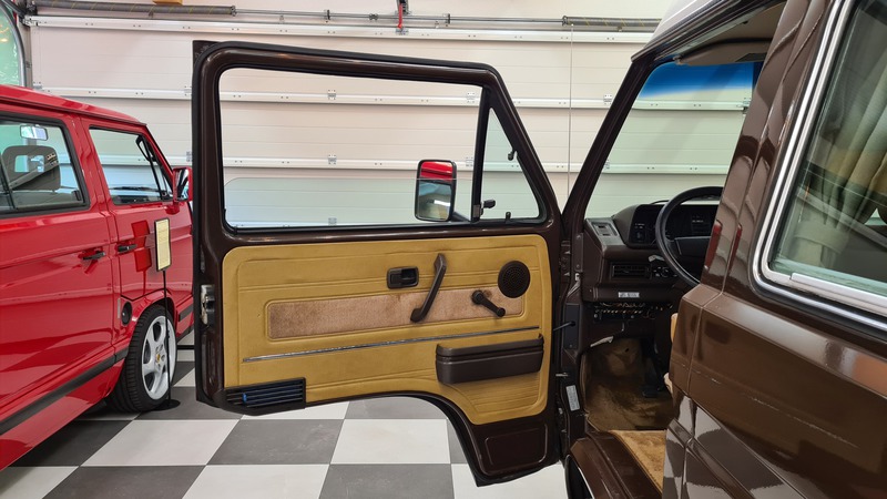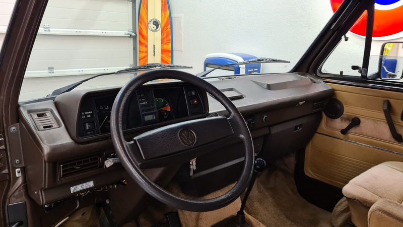 Der Bulli wurde im Oktober 1986 im VW-Nutzfahrzeug-Werk in Hannover gebaut und in die USA verschifft. Der Erstbesitzer hatte ihn als Wolfsburg Edition bestellt. Bei diesem Sondermodell wurden unter anderem Extras wie die grüne Wärmeschutzverglasung, mit Ausstellfenstern vorne und Schiebefenstern in der Mitte, das gepolstertem Armaturenbrett, sowie Velourssitze mit Armlehnen, sowie passend farbigem Teppich und passend farbigen Tür- und Seitenverkleidungen verbaut. Zudem weist das ´87er Modell eine Besonderheit auf, die es weder davor, noch danach, nochmal so gab. Es ist das einzige Modelljahr, bei dem der Wolfsburg Edition als Zwittermodell, noch mit den klassischen Chromstoßstangen, gleichzeitig aber schon mit Rechteckscheinwerfern ausgeliefert wurde. Zusätzlich gab es ab jetzt ausschließlich den großen 2,1 Liter Wasserboxer-Motor mit 95 PS (Motorkennbuchstabe MV). Die Weekender waren von VW für Kunden gedacht, die keinen Camper mit Küchenzeile benötigten, dennoch auf Ausflügen mit vier Personen in dem Wagen schlafen und zusätzliche Staumöglichkeiten haben wollten. So sind diese Bullis, ähnlich wie ein Multivan, mit ausklappbarem Tisch und Westfalia-Schlafbank ausgestattet. Darüber hinaus haben die Weekender das Westfalia Aufstelldach, unter dem zwei weitere Personen schlafen können, sowie ringsherum Gardinen und einen Stauschrank im Heck. Zusätzlich wurde dieser T3 ab Werk mit Servolenkung und Klimaanlage ausgeliefert. Durch die Servolenkung ist das originale Lenkrad kleiner. In der Kombination in dunkelbraun sieht man das normalerweise so gut wie nie. Die Klimaanlage ist bei den späteren Westfalia bzw. Weekendern vor dem Dachschrank montiert und ebenfalls sehr selten zu finden. Noch exklusiver geht es also kaum.