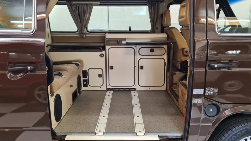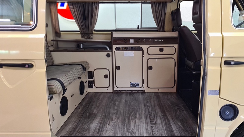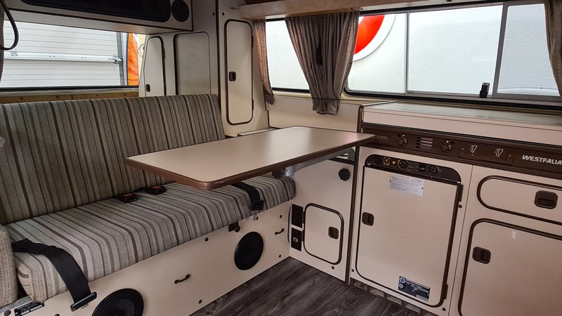 Passend zum warmen und trockenen Klima, befindet sich die Karosserie in sehr gut erhaltenem Zustand. Durch die Sonneneinstrahlung war der Lack allerdings bereits vor einigen Jahren so dünn geworden, dass sich sein Besitzer dazu entschied, den Camper im Originalfarbton neu lackieren zu lassen. Die Arbeiten wurden in guter Qualität durchgeführt, Scheibengummis und viele Anbauteile bei der anschließenden Montage erneuert. Gleichzeitig entschied er sich auch dazu, die Innenausstattung zu überarbeiten. Hierbei hat er leider den originalen Fahrersitz durch einen gebrauchten anderen T3 Sitz ersetzt. Die weiße Beschichtung am Innenhimmel und den Innenverkleidungen, die sich typischerweise durch die Hitze ebenfalls oft löst, wurde in Eigenregie überarbeitet. Es wurde viel Geld in Musik- und Alarmanlage gesteckt, sicherlich eine Geschmacksfrage, wir würden die Innenausstattung allerdings wieder in den Originalzustand zurückversetzen, was dennoch natürlich nicht zwingend notwendig ist.