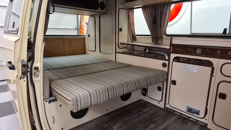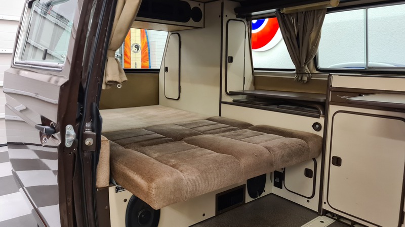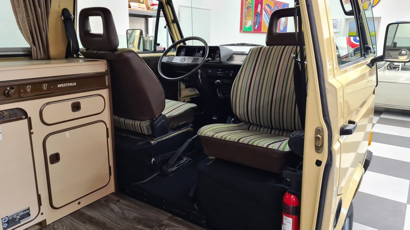 Und so kam der Bulli nach 41 Jahren vor ein paar Wochen zurück nach Deutschland. Für den TÜV mussten lediglich die Hauptscheinwerfer gegen europäische H4-Leuchten sowie wenige Verschleißteile an Bremse und Fahrwerk ausgetauscht werden. Der 1,9 Liter / 83 PS Wasserboxer-Motor (Motorkennbuchstabe DH) hat eine Inspektion erhalten. Der Rest der Technik machte bereits beim Kauf einen sehr gut gewarteten Eindruck. Die Karosserie ist natürlich ungeschweißt. Die Chromleisten in den Fensterdichtungen waren über die Jahre verfärbt, weshalb wir ringsherum neue montiert haben. Einige Kunststoffteile wie der Scheinwerfergrill und die Camping-Steckdosen wurden ebenfalls gegen Neuteile ersetzt. Die Felgen wurden entlackt, pulverbeschichtet, mit neuen Chromradkappen versehen und mit neuen Reifen montiert. Der Erstlack wurde poliert und versiegelt und befindet sich, abgesehen von ein paar Steinschlägen auf der Front bzw. minimalen Gebrauchsspuren, in einem sehr guten Zustand. Die Innenausstattung ist passend dazu ebenfalls unrestauriert und sehr gepflegt, der Faltenbalg im Aufstelldach wurde bereits im Vorbesitz gegen die Version mit drei Fenstern getauscht.