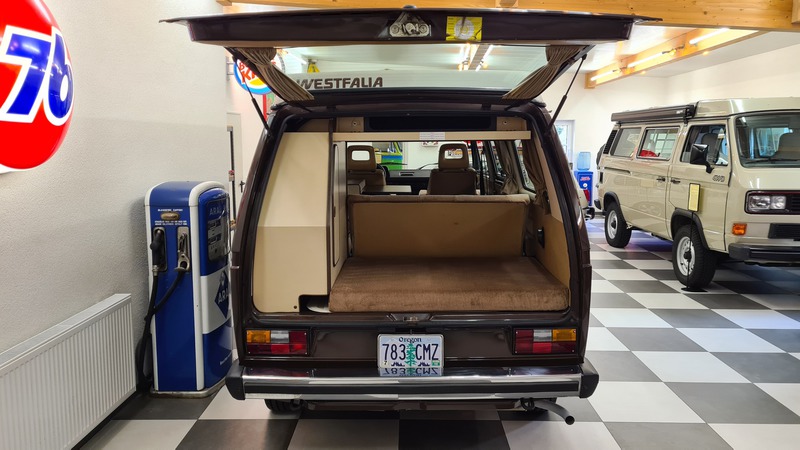 Wir konnten den Bulli auf unserer USA-Reise im November in Portland im Bundesstaat Oregon kaufen. Dort befand er sich seit 1996 in zweitem Besitz. Vom Band lief er im Januar 1985 und traf im März desselben Jahres in Oakland, dem Hafen von San Francisco, ein. Boardwalk Volkswagen aus Redwood City hatte ihn als „Vanagon GL“ bestellt, die höchste Ausstattungsvariante der Westfalia-Camper. Die Vanagon GL aus dem Baujahr 1985 haben neben grüner Wärmeschutzverglasung mit Ausstellfenstern vorne und Schiebefenstern in der Mitte auch Chromstoßstangen sowie Chromrahmen in den Scheibengummis. Der Innenraum wurde neben vielen weiteren Extras mit Velourssitzen versehen. Hier zudem mit dem sehr seltenen, zusätzlichen und herausnehmbaren Sitz für den Fahrgastraum. So hat dieser Westfalia anstelle der üblichen vier nun fünf eingetragene Sitzplätze. Darüber hinaus bestellte Boardwalk Volkswagen den Bulli mit Klimaanlage. Mehr Luxus konnte man in einem T3 Westfalia kaum finden. Die Campingausstattung bietet neben vorderen Drehsitzen Schlafplätze auf der zum Bett umklappbaren Rückbank sowie im Aufstelldach, einen Kocher, einen Kühlschrank sowie viele Staumöglichkeiten in der Küchenzeile und im Heckbereich.