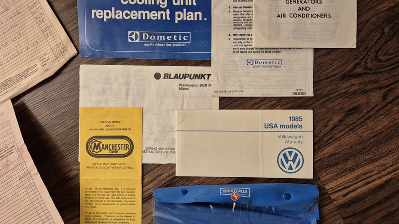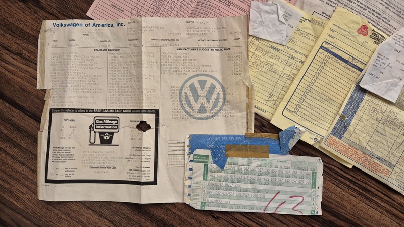 Auch wenn man es auf den ersten Blick wahrscheinlich kaum vermuten würde, bei diesem merianbraunen T3 Westfalia handelt es sich um ein unrestauriertes Erstlackfahrzeug. Der Bulli wurde immer sehr gepflegt und befindet sich bis heute in entsprechendem Zustand. Und was wir persönlich immer sehr spannend finden, auch alle Dokumente zur Historie sind vorhanden. Hier sogar zurück bis zum Windowsticker, dem offiziellen VW Informationsblatt, das bei jedem Neuwagen für die USA in der Scheibe angebracht war und alle Informationen und Ausstattungsdetails zum Fahrzeug erhält. Und nicht nur das, sogar die Montageanweisung von der Produktion im VW-Werk in Hannover ist noch vorhanden!