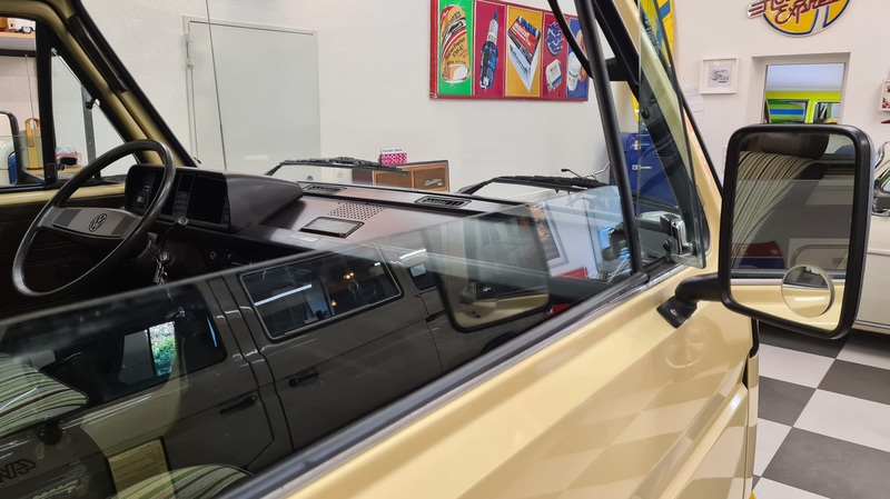 Unser Weekender erhielt ab Werk sehr viele Extras. Neben der Multivanbeplankung und den Multivan-Alufelgen wurde er mit den in Wagenfarbe lackierten, elektrisch verstellbaren Spiegeln, den Rechteckscheinwerfern, sowie ringsherum grüner Wärmeschutzverglasung, mit Ausstellfenstern vorne und Schiebefenstern in der Mitte versehen. Der Innenraum erhielt weitere Extras, wie das gepolsterte Armaturenbrett, mit Cockpit mit Drehzahlmesser und Digitaluhr, dem, wegen der verbauten Servolenkung kleinere Lenkrad und Velourssitze mit Armlehnen vorne. Der Erstbesitzer unseres Bullis bestellte zudem ein Automatikgetriebe, Tempomat, Zentralverriegelung und die selten zu findende Klimaanlage unter dem Hochbett.