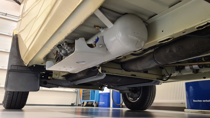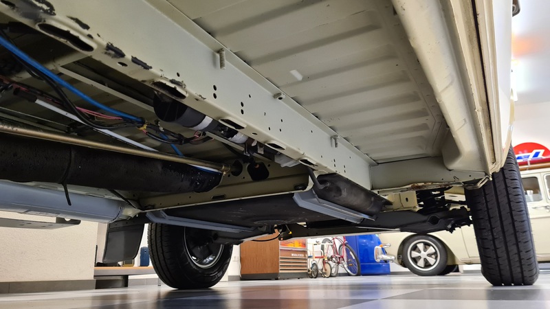 Passend zur Karosserie befand sich auch die Technik in guter Ausgangsbasis und bereits mit ein paar Upgrates, so waren unter anderem bereits Edelstahlwasserrohre montiert. Dennoch haben wir für die Zulassung in Deutschland auch hier viele Neuteile verbaut. So wurden unter anderem Verschleißteile an Bremse und Fahrwerk ersetzt. Die originalen Multivan-Alufelgen wurden entlackt, pulverbeschichtet und mit neuen Reifen und Nabenkappen versehen. Ein neuer Tank mitsamt neuen Benzinschläuchen wurde verbaut, eine Inspektion am 2,1 Liter / 95PS Wasserboxermotor (Motorkennbuchstabe MV), sowie am Automatikgetriebe, mit dem Austausch der Flüssigkeiten, neuen Zündkerzen und -kabeln etc. durchgeführt. Ein neuer Klimakompresser wurde verbaut, die Klimaanlage auf aktuelles R134a Kältemittel umgerüstet und frisch befüllt, sowie viele weitere kleinere Arbeiten durchgeführt.