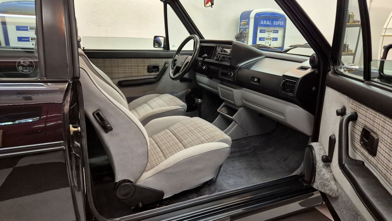 Der Bulli wurde, als einer der letzten T3, im August 1990, im VW-Nutzfahrzeugewerk in Hannover gebaut, hier bereits als 1991er Modell. Auch er hat die umfangreiche Ausstattung der Carat, bzw. Wolfsburg Edition Sondermodelle verbaut. Außen hatten diese Fahrzeuge die „dicken“ Stoßstangen mit Frontspoiler, die passenden Seitenbeplankungen, die in Wagenfarbe lackierten, elektrisch verstellbaren Spiegel und die rechteckigen Doppelscheinwerfer. Innen gibt es die Multivan-Ausstattung, somit die zum Bett umklappbare Rückbank, den ausklappbaren Tisch, die beiden Back to Back Sitze, sowie Armlehnen an den vorderen Sitzen. Hier alles im gestreiften Veloursstoff, wie er auch in den Blue- und Whitestar, bzw. in den Limited Last Edition Sondermodellen verbaut wurde. Für den US-Markt gab es ab Werk zusätzlich die grüne Wärmeschutzverglasung mit Ausstellfenstern vorne und Schiebefenstern in der Mitte, die große Klimaanlage, das gepolsterte Armaturenbrett, das passend zur Servolenkung kleinere und ebenfalls gepolsterte Lenkrad, Drehzahlmesser, Tempomat, Zentralverriegelung und viele weitere Extras. Die Dame bestellte ihren Bulli selbstredend zusätzlich als Automatik, auch er ist also ausgestattet, wie es umfangreicher kaum möglich ist.
