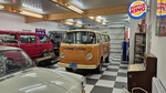 Der Bulli befand sich bereits bei unserem Ankauf in sehr gut erhaltenem Karosseriezustand und annähernd komplett im Erstlack. Der Lack hatte durch die kalifornische Sonne allerdings sehr gelitten, so dass wir uns für eine Neulackierung im Originalfarbton entschieden haben. Der anschließende Aufbau erfolgte unter Verwendung sehr vieler Neuteile, bzw. überarbeiteter Originalteile. So wurden, neben neuen Scheibend- und Türdichtungen, ringsherum neue Leuchten verbaut, ein neuer Kühler-, sowie Scheinwerfergrill, eine neue Antenne, neue Leisten, neue Embleme und sehr viele weitere neue Kleinteile montiert. Die Innenausstattung ist bis heute original und in gepflegtem Zustand, sie wurde aktuell aufbereitet, der originale Teppich und die Bezüge gereinigt. Die Back to Back Sitze haben neue Seitenverkleidungen erhalten.